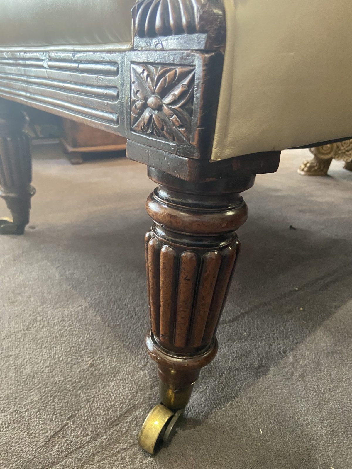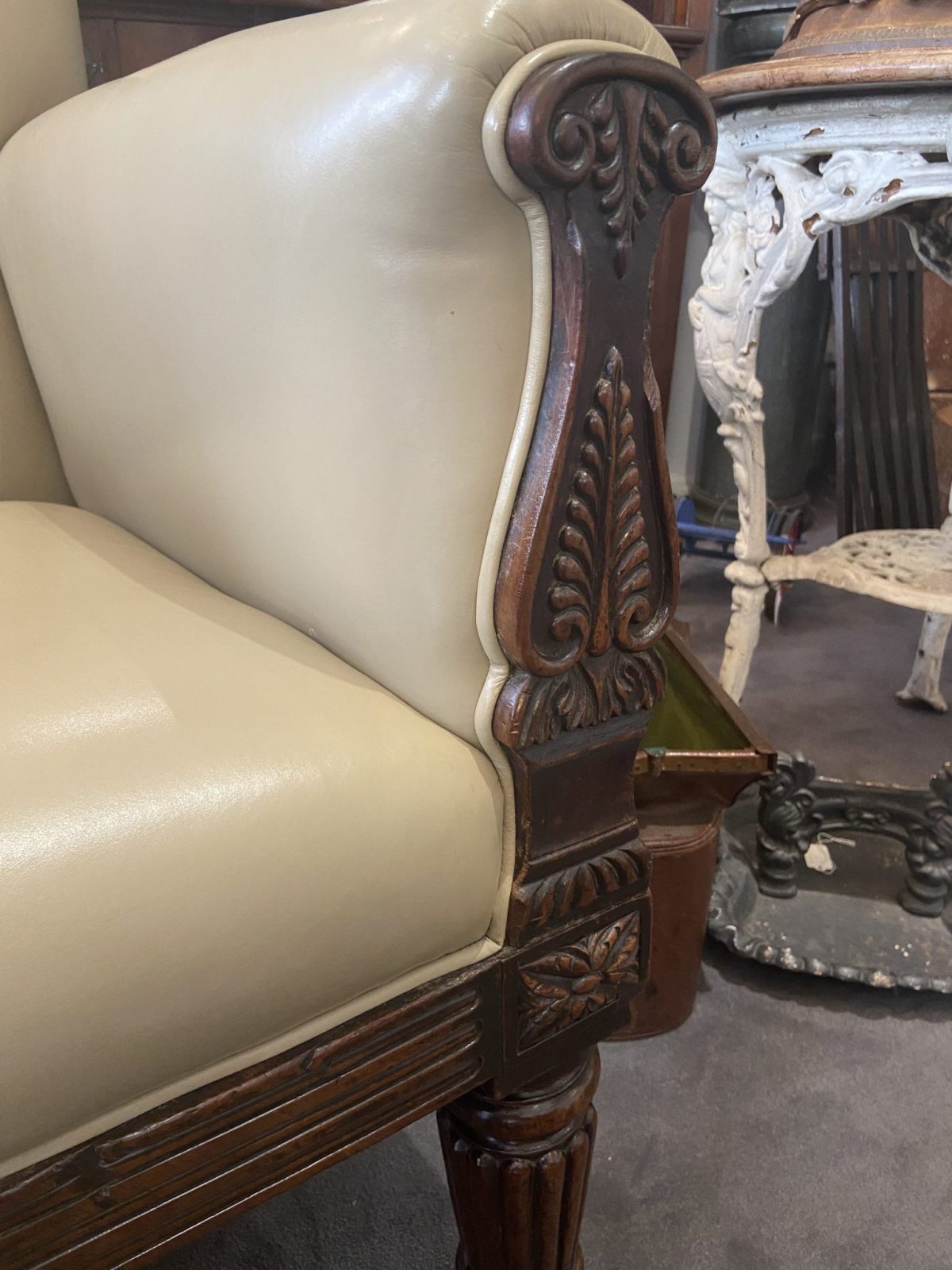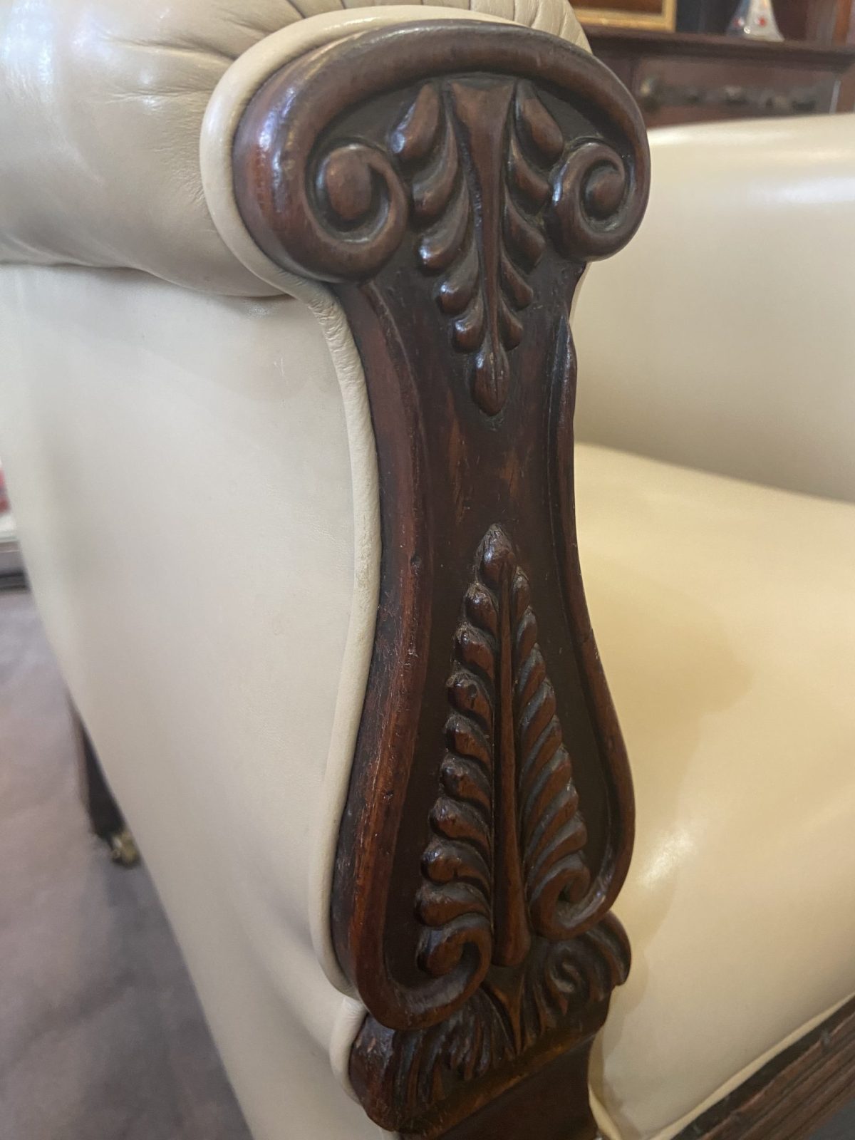 Superb William IV Period Mahogany Armchair William IV period carved mahogany armchair, recovered in hand dyed hide. The mahogany retains fine original colour.Circa 1830 69cms wide78cms deep103cms high Price: £ 1850 (Available)